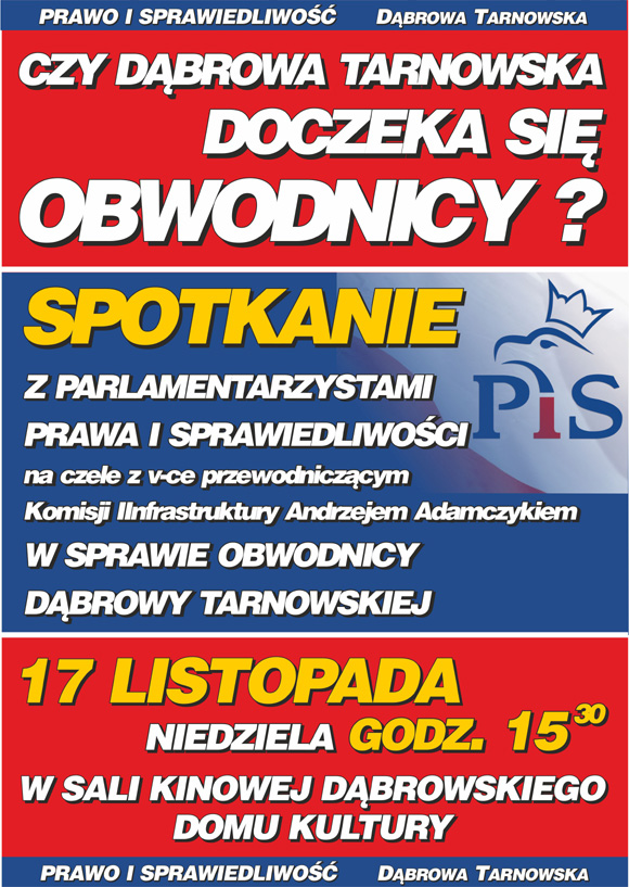 Prawo i Sprawiedliwość z Dąbrowy Tarnowskiej zaprasza 17 listopada (niedziela), godz. 15:30, na spotkanie w sprawie obwodnicy miasta z parlamentarzystami PiS. Na czele z v-ce przewodniczącym Komisji Infrastruktury Andrzejem Adamczykiem.