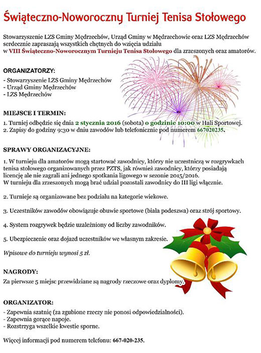 Stowarzyszenie LZS Gminy Mędrzechów, Urząd Gminy Mędrzechów oraz LZS Mędrzechów serdecznie zapraszają wszystkich chętnych do wzięcia udziału w VIII Swiąteczno- Noworocznym Turnieju Tenisa Stołowego.