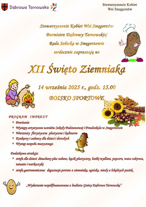 Stowarzyszenie Kobiet Wsi Smęgorzów, Burmistrz Dąbrowy Tarnowskiej oraz Rada Sołecka Smęgorzowa serdecznie zapraszają na XII Święto Ziemniaka, które odbędzie się 14 września 2025 r. o godz. 15:00 na boisku sportowym w Smęgorzowie.