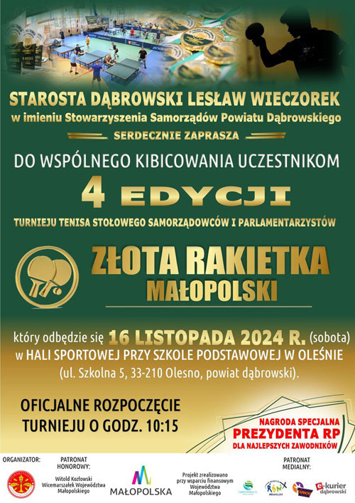 Starosta Dąbrowski Lesław Wieczorek w imieniu Stowarzyszenia Samorządów Powiatu Dąbrowskiego serdecznie zaprasza do wspólnego kibicowania uczestnikom IV edycji Turnieju Tenisa Stołowego Samorządowców i Parlamentarzystów „Złota Rakietka Małopolski”.