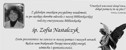 24 grudnia br. w wieku 88 lat, po ciężkiej chorobie, zmarła Zofia Nastalczyk – emerytowany pracownik Miejskiej Biblioteki Publicznej w Dąbrowie Tarnowskiej.