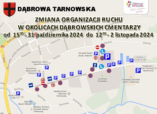 Podobnie jak w latach ubiegłych w okresie Świąt Wszystkich Świętych tj. w dniach 31 października 2024 r. od godz. 15:00 do 2 listopada 2024 r. do godz. 12:00 wprowadzona zostanie czasowa zmiana organizacji ruchu w obrębie cmentarza parafialnego w Dąbrowie Tarnowskiej.