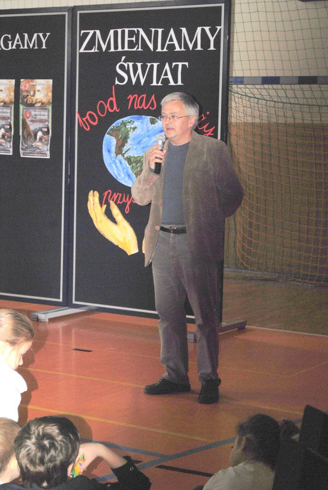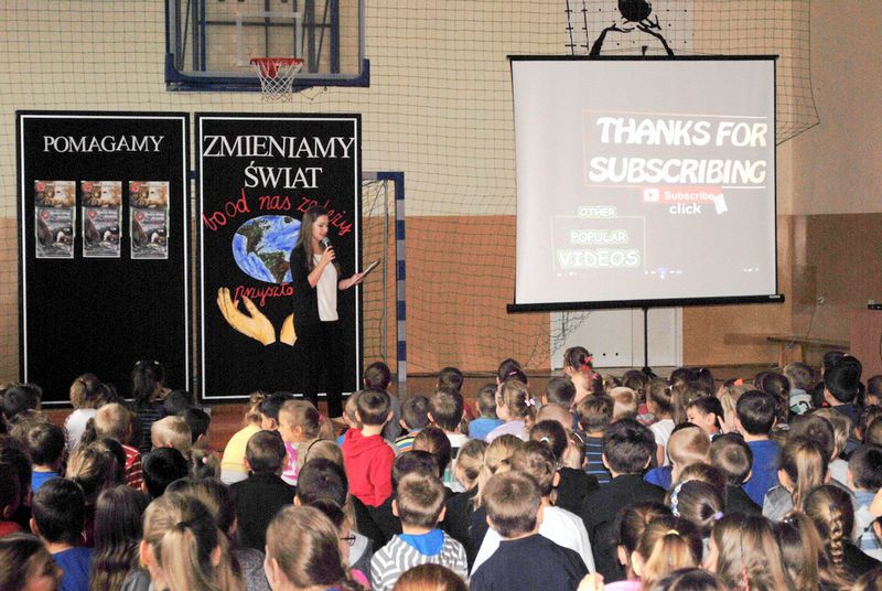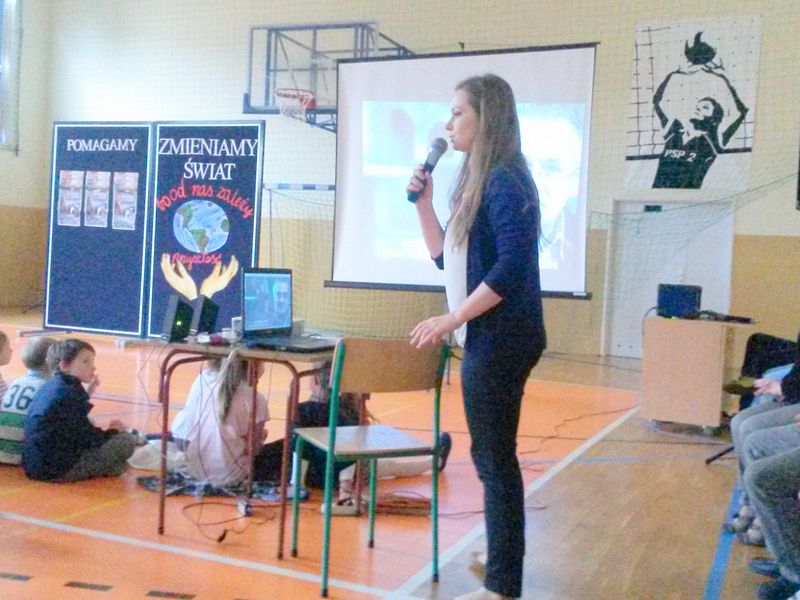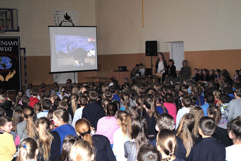 Przedstawiciel fundacji Zmieńmy Świat opowiadał uczniom o swojej pracy i działaniach jakie sam podejmuje by pomagać zwierzętom. Zwrócił szczególną uwagę na to że Świat mogą zmienić tylko oni i oni są jego przyszłością. Spotkanie uświetniło rozwieszenie plakatów informujących o zbiórce puszek i karm dla zwierząt, która to będzie prowadzona przez cały rok szkolny 2015/2016.