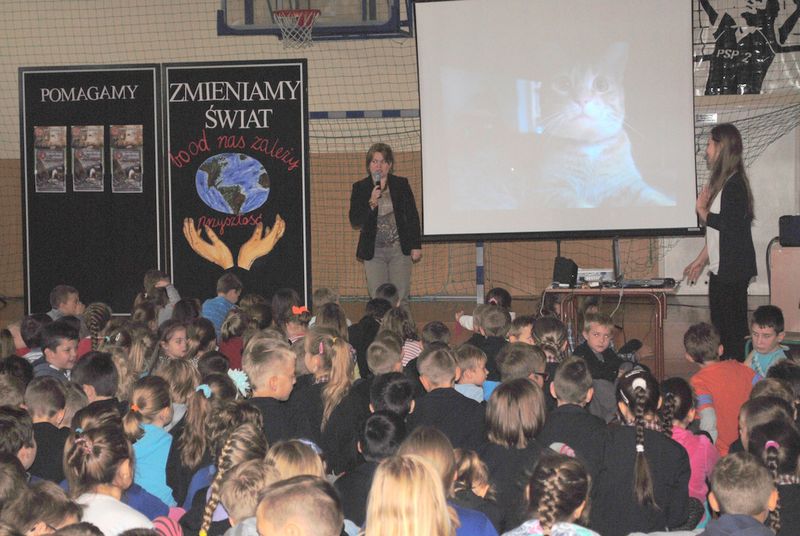 Pierwsze spotkanie dla uczniów całej szkoły rozpoczęło się od prelekcji dotyczącej opieki nad zwierzętami przeprowadzonej przez panią Agnieszkę Śliwa – główną organizatorkę i pomysłodawczyni akcji. Najważniejszym elementem uroczystości było spotkanie z Panem Krzysztofem Giemzą założycielem Fundacji Zmieńmy Świat, która to będzie ściśle współpracować ze Szkołą Podstawową nr 2 w Dąbrowie Tarnowskiej.