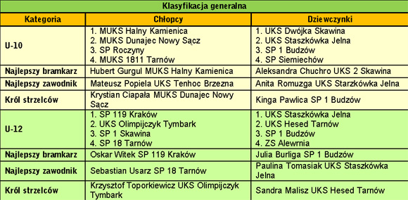 W zakończonym finale wojewódzkim XIV edycji Turnieju „Z Podwórka na Stadion o Puchar Tymbarku” triumfowały zespoły UKS Dwójka Skawina i MUKS Halny Kamienica w kategorii U-10 oraz UKS Staszkówka Jelna i SP 119 Kraków w U-12. Zwycięskie zespoły będą stanowić trzon reprezentacji województwa małopolskiego w finale ogólnopolskim, który rozstrzygnie się już 2 maja na Stadionie Narodowym w Warszawie. Najlepsi z najlepszych wyjadą na mecz Niemcy-Polska do Hamburga.