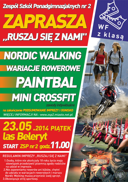Zespół Szkół Ponadgimnazjalnych nr 2 w Dąbrowie Tarnowskiej serdecznie zaprasza na imprezę pn. „Ruszaj się z nami”. W programie: Nordic Walking (przejście około 4 km), wariacje rowerowe (przejazd i tor przeszkód), paintball, indywidualne zawody MINI CROSS FIT-owe.