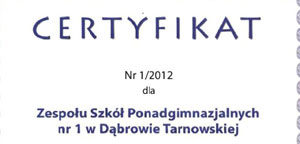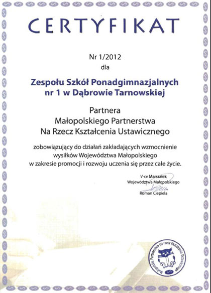 ZSP nr 1 otrzymał od Wicemarszałka Województwa Małopolskiego Romana Ciepieli, Przewodniczącego Rady Programowej Małopolskiego Partnerstwa na rzecz Kształcenia Ustawicznego, certyfikat przyjęcia do programu.