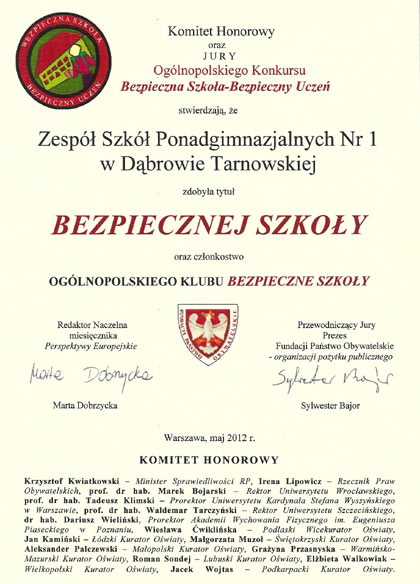 4 czerwca 2012 ZSP nr 1 otrzymało tytuł Bezpiecznej Szkoły w ramach w Ogólnopolskiego Konkursu Bezpieczna Szkoła – Bezpieczny Uczeń. Po opieką Przemysława Kołodzieja i pedagoga Martyny Bartoń przy współpracy nauczycieli: psychologa Mariusza Wielgusa, Wioletty Górowskiej-Kmieć, Krzysztofa Słupka, Danuty Bielaszki, Łukasza Świętochowskiego, Małgorzaty Owsiany uczniowie wzięli udział w Ogólnopolskim Konkursie Bezpieczna Szkoła – Bezpieczny Uczeń.
