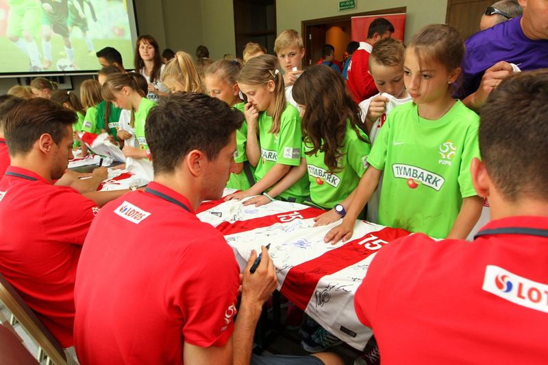 Długi piłkarski weekend wypełniony biało-czerwonymi emocjami rozpoczął się w czwartek, 11 czerwca, od wizyty w hotelu Double Tree by Hilton w Warszawie, gdzie kadrowicze trenera Adama Nawałki mieszkali podczas przedmeczowego zgrupowania. W ekskluzywnym spotkaniu udział wzięła cała Reprezentacja Polski ze sztabem szkoleniowym oraz Prezes PZPN Zbigniew Boniek. Kadrowicze na stojąco, oklaskami przywitali zwycięskie drużyny. Podczas spotkania laureaci Turnieju mogli porozmawiać z piłkarzami, zrobić sobie wspólne zdjęcia oraz zdobyć autografy idoli. Arkadiusz Milik, Robert Lewandowski i Grzegorz Krychowiak odpowiadali na pytania dziewcząt i chłopców, opowiadając o swoich piłkarskich początkach i sportowych przeżyciach. Każde dziecko otrzymało na pamiątkę koszulkę Reprezentacji Polski, na której podpisali się wszyscy kadrowicze.