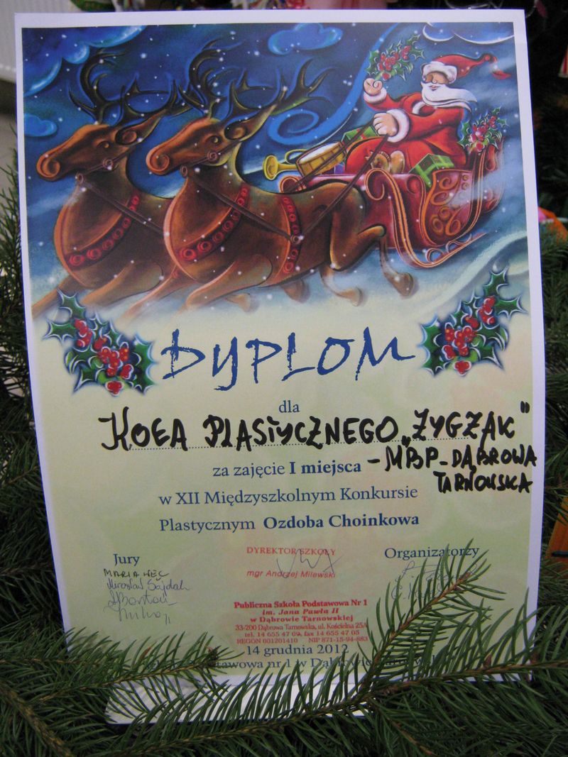 Trud włożony w przygotowanie tych ozdób zakończył się sukcesem, gdyż komisja konkursowa oceniła je wysoko przyznając I miejsce. Pamiątką udziału w tym świątecznym konkursie jest dyplom oraz nagroda rzeczowa. Wszystkich ogarnęła ogromna radość, że choć troszeczkę mogli pomóc kolegom i koleżankom z Czarnego Lądu.