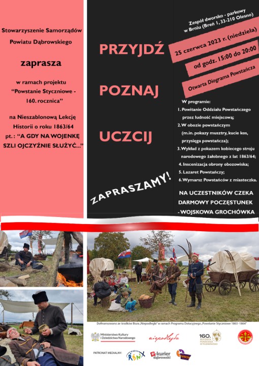 Stowarzyszenie Samorządów Powiatu Dąbrowskiego serdecznie zaprasza wszystkich pasjonatów historii i nie tylko na Nieszablonową Lekcję Historii o roku 1863/64 pt. „A gdy na wojenkę szli ojczyźnie służyć…”